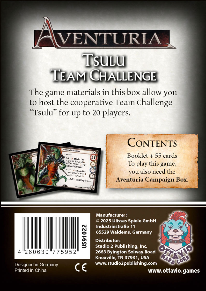 The Team Challenge Tsulu is a fully cooperative, multi-parallel group adventure that uses Aventuria rules. All heroes compete together against a horde of enemies commanded by dangerous leaders.