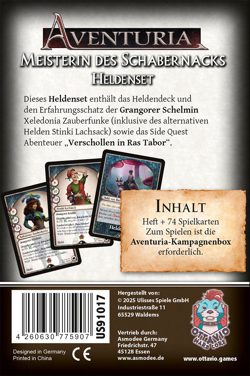 Dieses Heldenset enthält das Heldendeck und den Erfahrungsschatz der Grangorer Schelmin Xeledonia Zauberfunke (inklusive des alternativen Helden Stinki Lachsack) sowie das Side Quest Abenteuer „Verschollen in Ras Tabor“.