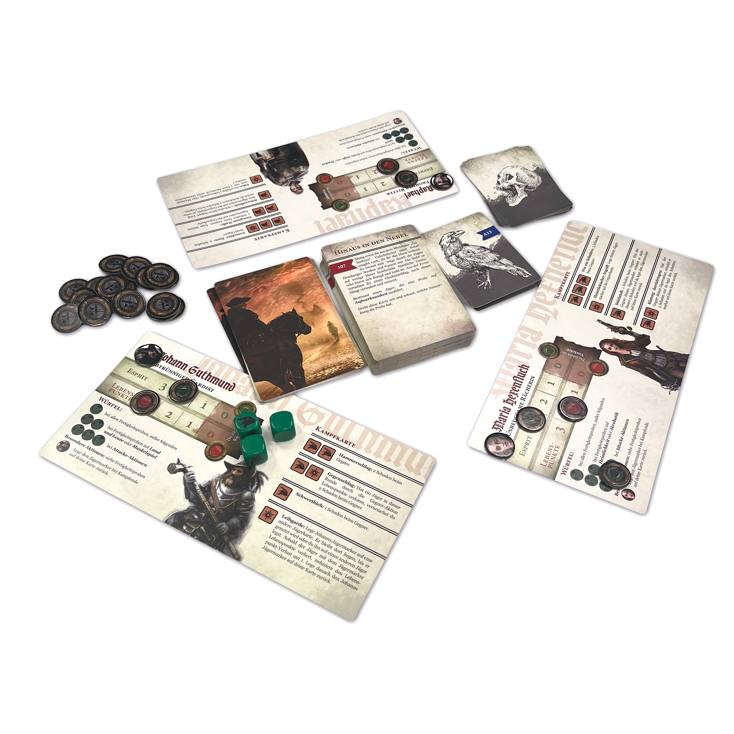 - 7 großformatige Karten (für die Helden und Spielmitte)