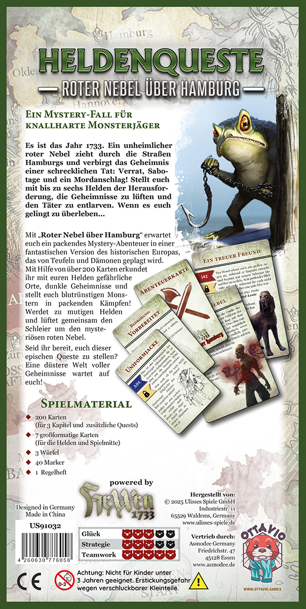 Mit Roter Nebel über Hamburg erwartet euch ein packendes Mystery-Abenteuer in einer fantastischen Version des historischen Europas, das von Teufeln und Dämonen geplagt wird. Mit Hilfe von über 200 Karten erkundet ihr mit euren Helden gefährliche Orte, dunkle Geheimnisse und stellt euch blutrünstigen Monstern in packenden Kämpfen! Werdet zu mutigen Helden und lüftet gemeinsam den Schleier um den mysteriösen roten Nebel.