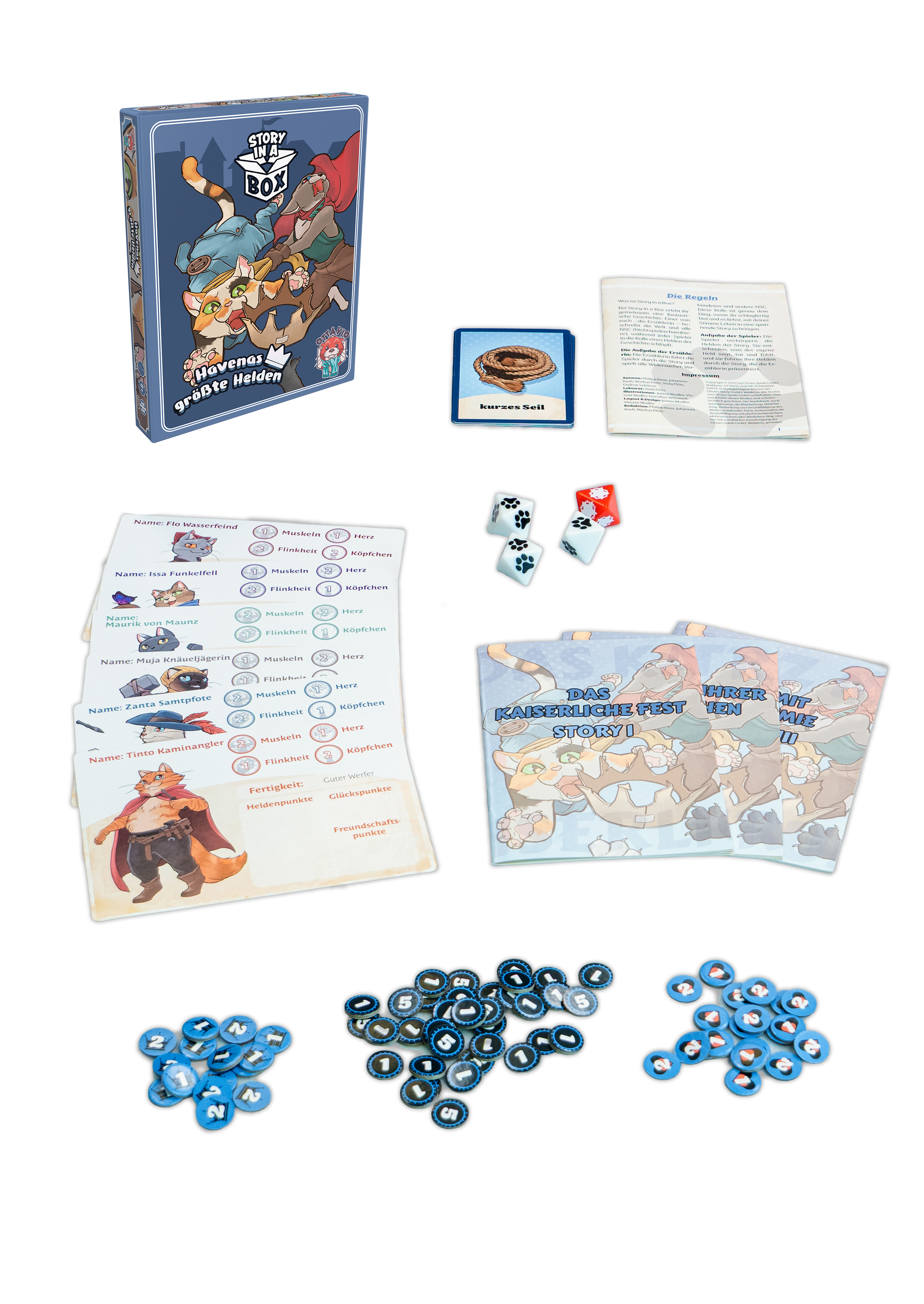 Story in a Box ist ein kooperatives Erzählspiel, bei dem du gemeinsam mit Familie und Freunden unterhaltsame Abenteuer erlebst und eine von euch führt mit den hilfreichen Abenteuer-Heften als Erzählerin durch die Welt. Mit Witz, Fantasie und ein wenig Würfelglück lenkt ihr eure tierischen Helden durch ein turbulentes Abenteuer, um in jeder Partie eine neue Geschichte zum Leben zu erwecken!