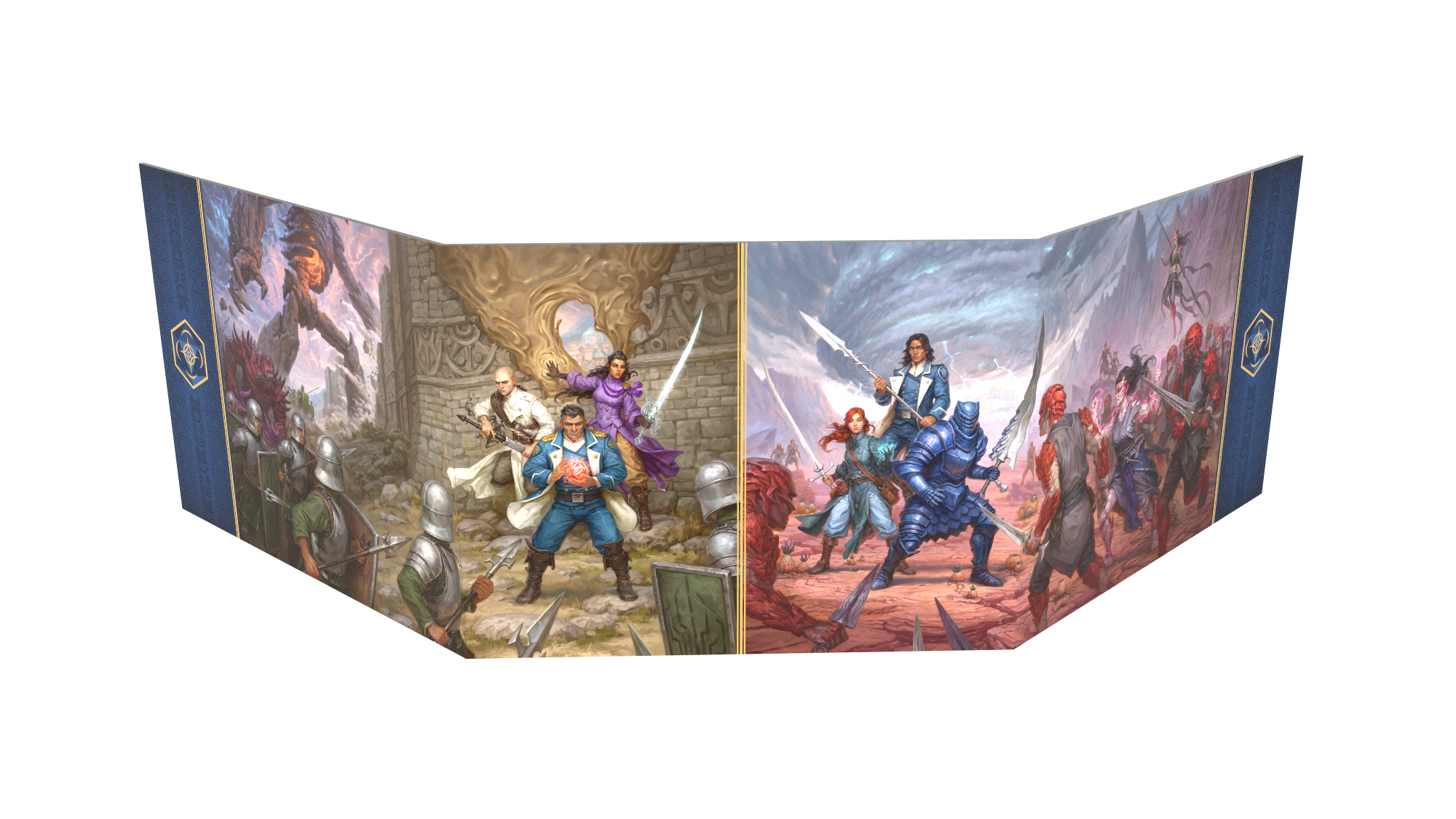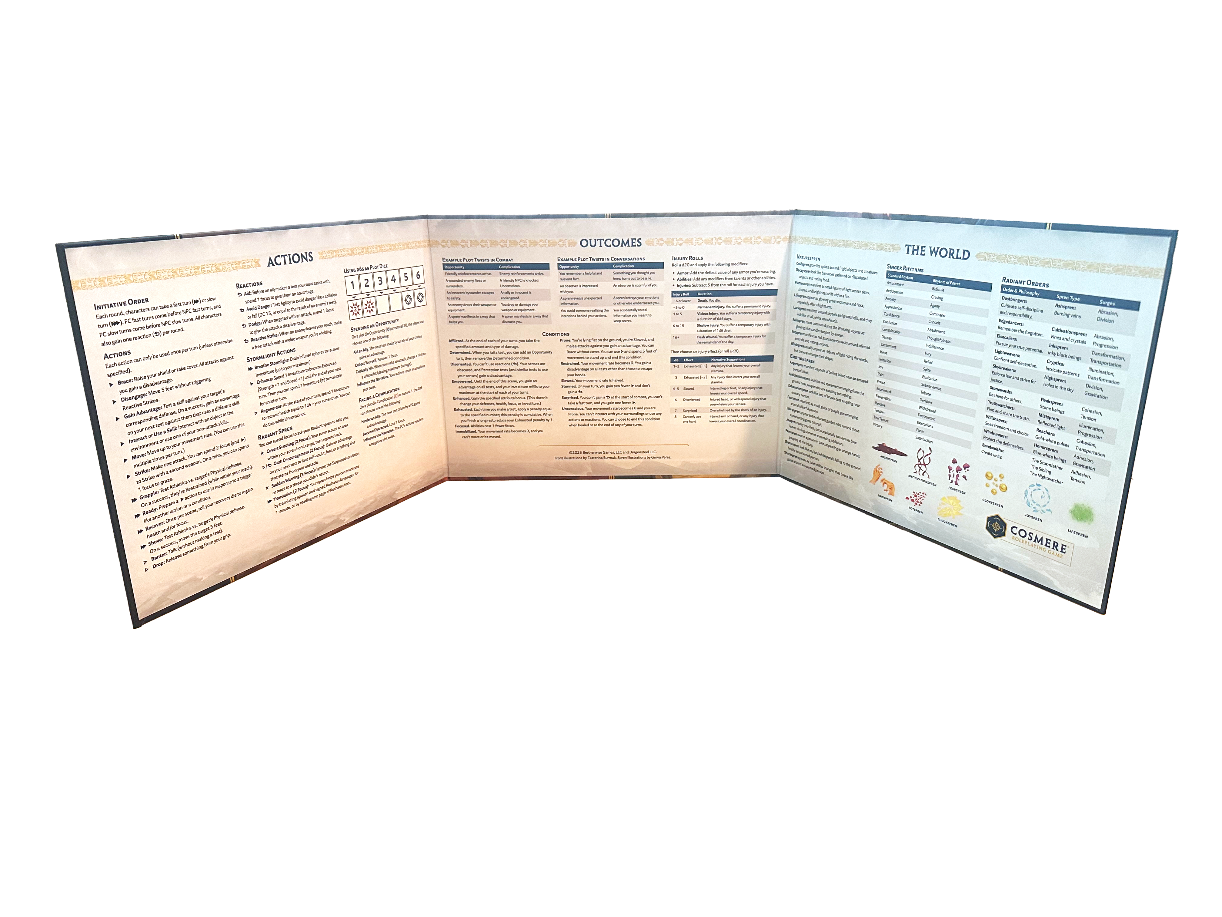 Dieser GM-Bildschirm enthält hilfreiche Informationen und Tabellen für die Spielleitung über Aktionen, Ergebnisse und die Welt von Roshar. Perfekt um die Notizen der Spielleitung zu verbergen und als schnelle Referenz für die wichtigsten Regeln.