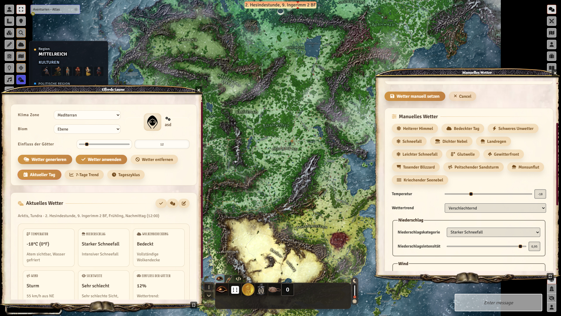 Als atmosphärisches Highlight kommt ein Wettersystem, das Wetter dynamisch nach Klimazone, Biom, Jahreszeit und Tageszeit erzeugt – inklusive visueller Effekte wie Regen, Schnee oder Nebel sowie Ambiente-Audio (Wind, Regen, Sturm). Eine 7-Tage-Vorhersage unterstützt die Planung, während ein GM-Override jederzeit dramaturgische Wetterwechsel ermöglicht. Abgerundet wird alles durch Regions-Overlays (Grenzen, Territorien, Regionen), DSA5-Kalender-Support und Journal-Verknüpfungen – optimiert für große Karten und Foundry VTT v13.