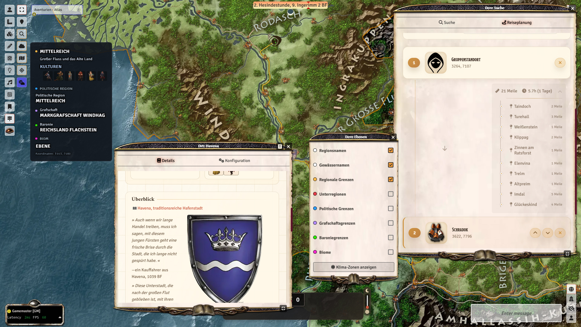 Das Modul bietet eine hochauflösende Weltkarte mit über 2000 Orten (Städte, Dörfer, Landmarken) inklusive Suche. Mit der intelligenten Routenplanung werden Wege automatisch unter Berücksichtigung von Gelände und Straßentypen berechnet, ergänzt durch Reisezeit-Schätzungen je Fortbewegungsart (zu Fuß, Pferd, Schiff u. a.). Für Spielleiter, die Reisen aktiv ausspielen wollen, gibt es eine Reisesimulation mit Tag/Nacht-Zyklus, automatischen Pausen und Gruppen-Tracking per Marker samt Zeitfortschreitung.