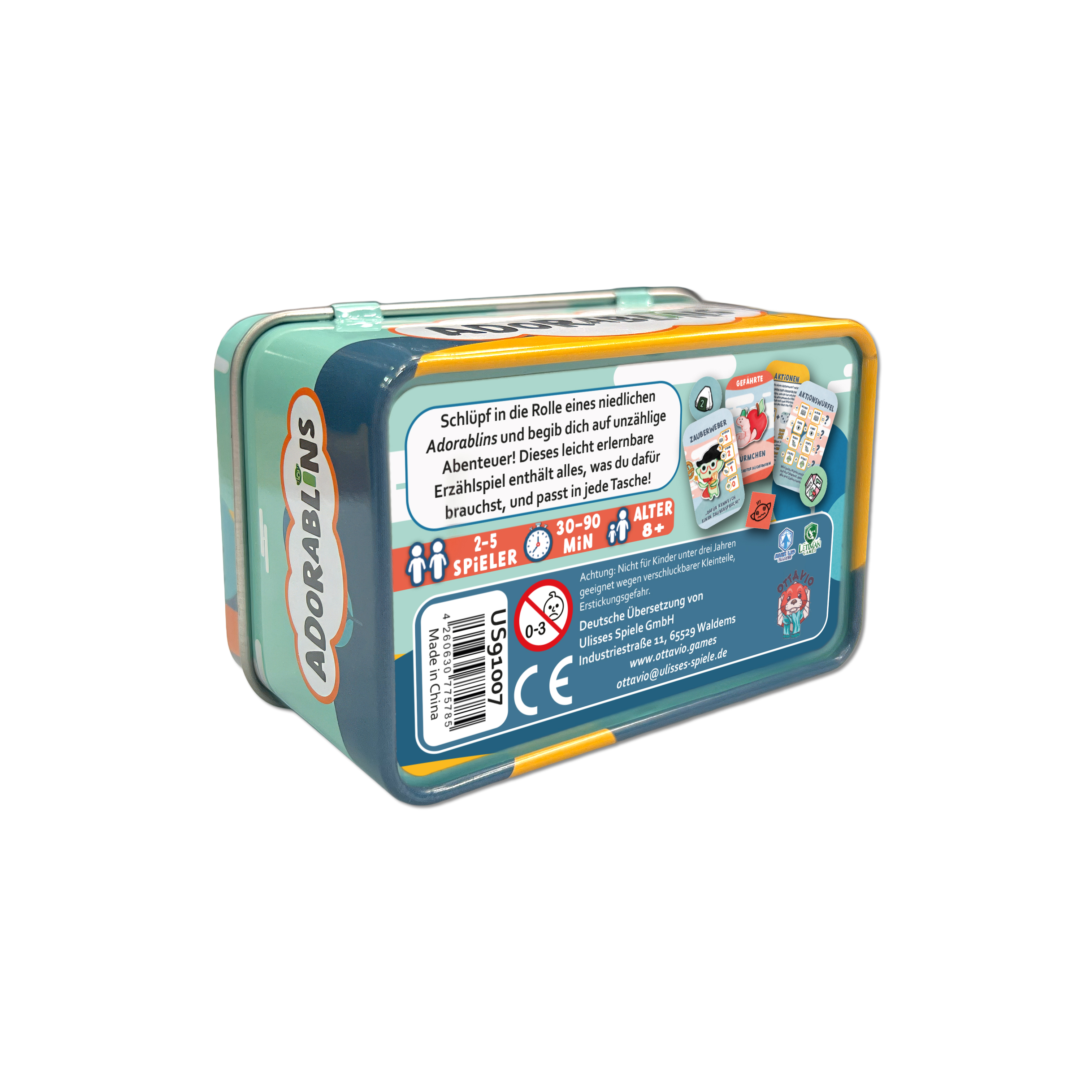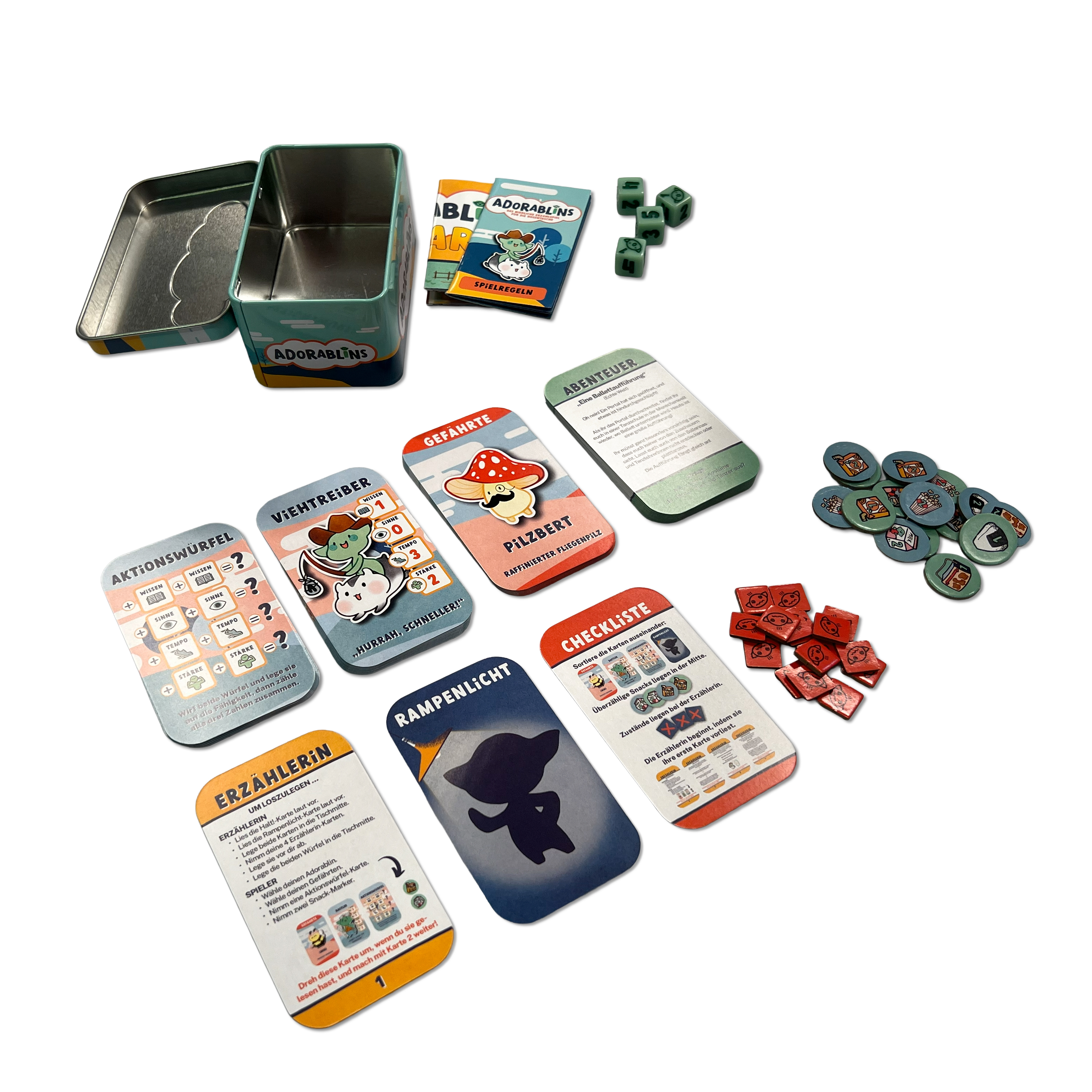 Adorablins ist ein supersüßes und leicht zu erlernendes Erzählspiel, bei dem du und deine Freunde als kleine koboldähnliche Kreaturen Abenteuer an unendlich vielen Orten erleben. Ein Spiel dauert etwa 30 Minuten, kann aber frei ausgedehnt werden. Die Erzählerin sollte mindestens 8 Jahre alt sein, die weiteren Spieler können problemlos auch etwas jünger sein. Alles, was man zum Spielen braucht, befindet sich in einer tragbaren Dose, die in jede Hosentasche passt!